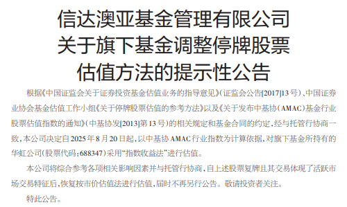 中国经济网络北京,8月21日,Cinda Aoya Fund Management Co.,Ltd。宣布提醒人们公告,以调整如何调整基金的估值以中止该行动。该公告宣布,该公司已决定使用基于中国基金协会AMAC行业指数以来基金自2025年8月20日以来由基金持有的Huahong Company(行动守则:688347)评估的“指数收入法”。我们将对各种相关影响因素提供不可或缺的愿景,并与管理银行进行谈判。先前的行动将恢复谈判,并且由于交易反映了主动市场交易的特征,因此评估将根据评估TheSarket评估的方法恢复,并且当时不会进行其他广告。